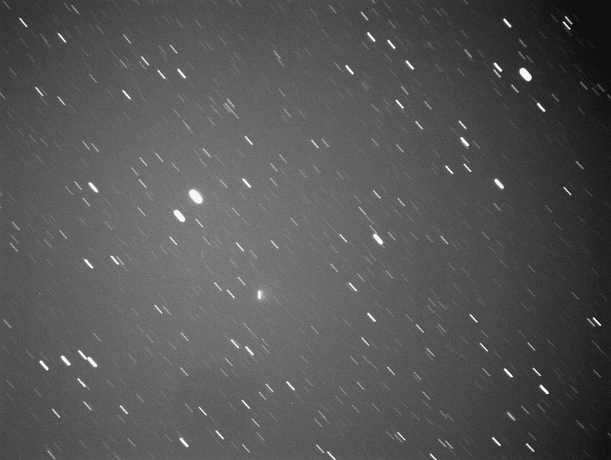 Exposure 14 March 2016 start time 21h42m49.820s UT, exposure 15.000 seconds - time accurate to better than 50 milliseconds ( ccd camera shutter is GPS controlled). Telescope 102mm aperture f/5 SKYWATCHER refractor converted to a focal length of 323mm with a home made focal reducer so optical quality leaves a bit to be desired and some vignetting. Field of view 191.2 by 144.0 arc minutes. Image scale 13.81 arc seconds. Seeing was however about 22 arc seconds!!! - not the best. I've blown up the region of interest which shows the fainter main payload leading and followed by the brighter BRITZ rocket. The identifications were provided to me by ISON as they make use of my observations - they actually supplied the CCD camera and GPS system. The range at the time was about 27000 km .