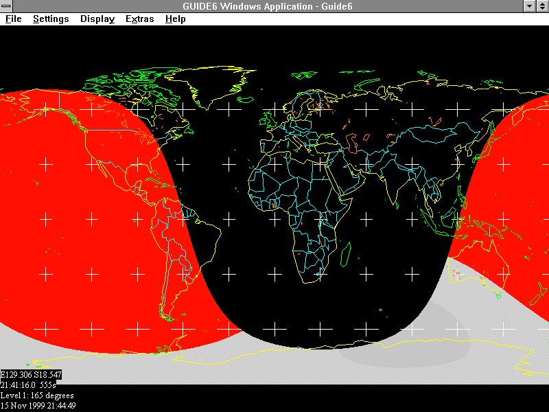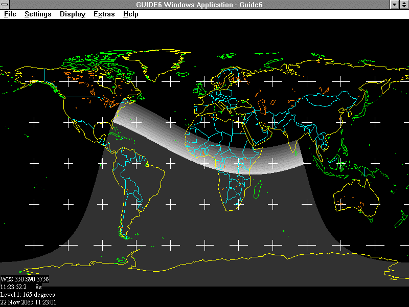 Eventually, you will reach the new moon on 26 Feb 1998. This time, click on "Show Eclipse" instead. Guide will switch to a chart showing a map of the earth at Level 1, with the path of the eclipse shown. The menus will change to contain only those items that are still valid for maps of the earth (features such as "Go to Constellation" are not very useful with such maps, for example.)